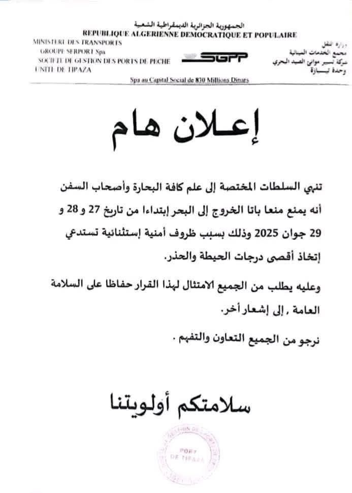 في خطوة مفاجئة أثارت تساؤلات كثيرة، أصدرت وحدة تسيير موانئ الصيد البحري بتيبازة التابعة لوزارة النقل الجزائرية إعلانًا رسميًا تقرر بموجبه منع الخروج إلى البحر لجميع البحارة وأصحاب السفن، ابتداءً من 27 إلى 29 يونيو 2025، مشيرة إلى أن هذا القرار يأتي "بسبب ظروف أمنية استثنائية تستدعي اتخاذ أقصى درجات الحيطة والحذر"، دون تقديم تفاصيل إضافية.