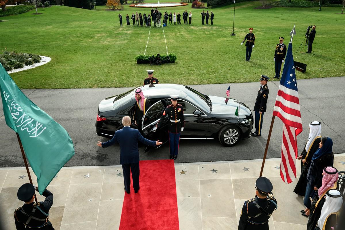 وفي أول زيارة له إلى البيت الأبيض منذ أكثر من سبع سنوات، استقبل ترامب الأمير محمد في احتفال اتسم بالبذخ في الحديقة الجنوبية بالبيت الأبيض، تضمن استعراض حرس الشرف العسكري وتم إطلاق 21 طلقة مدفعية بينما حلقت طائرات حربية أميركية في السماء.