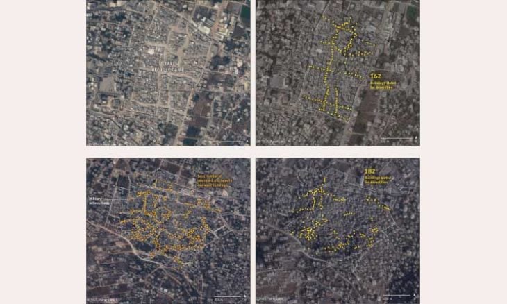كما توصل تحليل «هيومن رايتس ووتش» لصور الأقمار الصناعية إلى أنه بعد ستة أشهر، دُمّر أكثر من 850 منزلًا ومبنى آخر في المخيمات الثلاثة أو أُلحقت بها أضرار جسيمة.