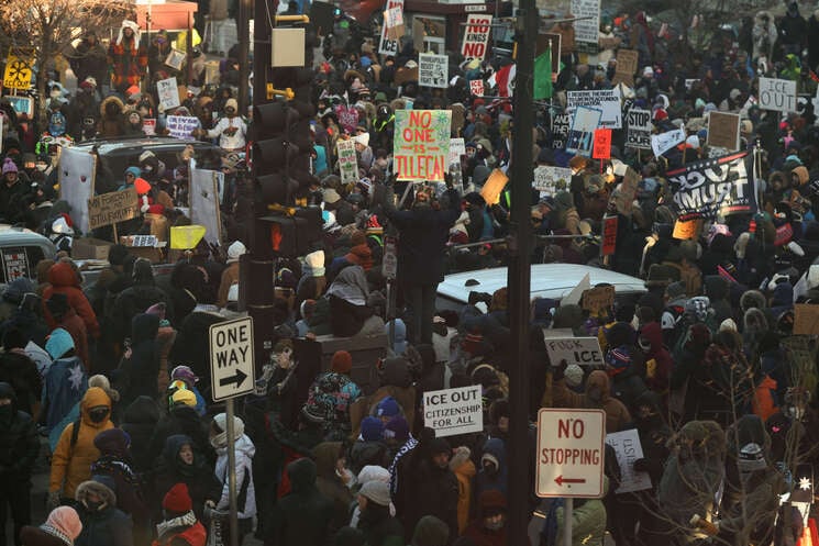 بعد أسابيع من نشر إدارة الرئيس الأمريكي دونالد ترامب آلاف عناصر الهجرة الفدراليين في مينيسوتا، في عملية شهدت—بحسب روايات محلية— مقتل مراقب قانوني وأمّ شابة برصاص عناصر، وسحب مواطنين أمريكيين من منازلهم ومركباتهم على أيدي ضباط مقنّعين، وإلقاء قنبلة غاز على متظاهرين سلميين من مسؤول رفيع في حرس الحدود، واحتجاز أطفال لا تتجاوز أعمارهم عامين، وانتشار عناصر مسلحة في أرجاء المدن؛ خرج سكان «المدن التوأم» -مينيابوليس وسانت بول- يوم الجمعة في مسيرات حاشدة رغم درجات حرارة تحت الصفر.