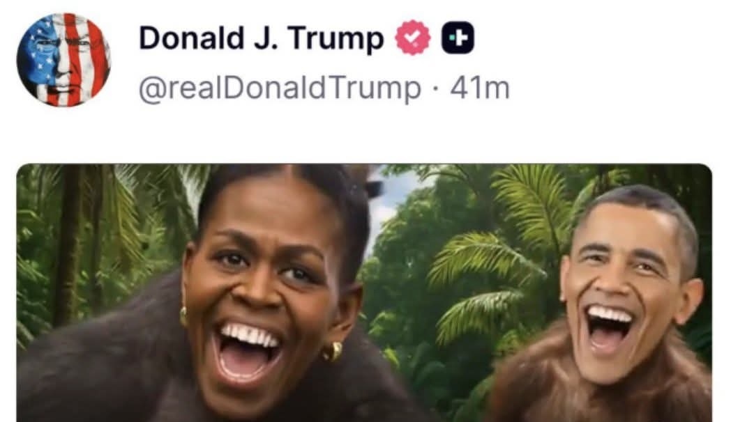 وفي وقت متأخر من مساء أمس الخميس، شارك الرئيس الأمريكي دونالد ترامب مقطعا مدته دقيقة واحدة يضخم مزاعمه بأن هزيمته في انتخابات 2020 جاءت نتيجة تزوير، وهي ادعاءات ثبت فيما بعد أنها خاطئة. وظهرت خلال المقطع لقطة، يبدو أنها مولدة بالذكاء الاصطناعي، لقردين راقصين رُكب عليهما رأسا أوباما وزوجته.