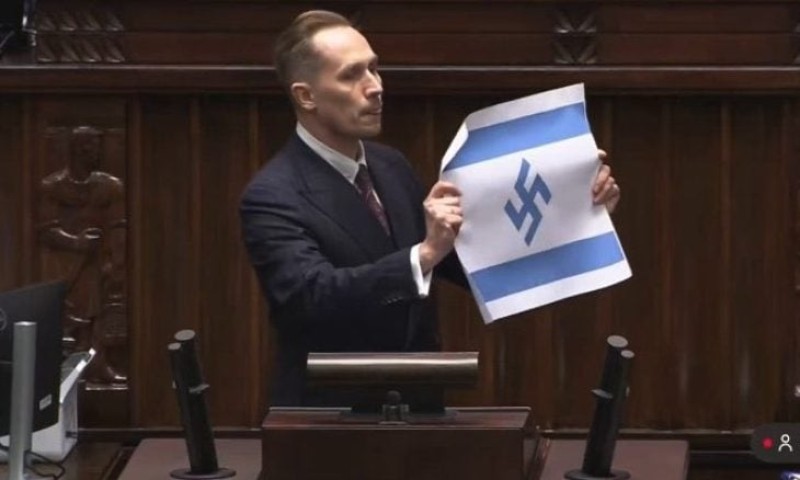رفع النائب البولندي كونراد بيركوفيتش، علما إسرائيليا يحمل رمز الصليب المعقوف النازي، للإشارة إلى ارتكابها إبادة جماعية أمام أنظار العالم.
