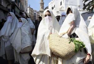تظاهرت نساء في العاصمة الجزائرية مرتديات ثيابا بيضاء من رؤوسهن الى اخمص اقدامهن، وقد غطين وجوههن جزئيا بقطع من القماش المطرز، وهتفن "عاشت الجزائر جزائرية"، بهدف الترويج للباس التقليدي في هذا البلد في ظل انتشار الحجاب الاسود والنقاب الغريبين عن تقاليده.